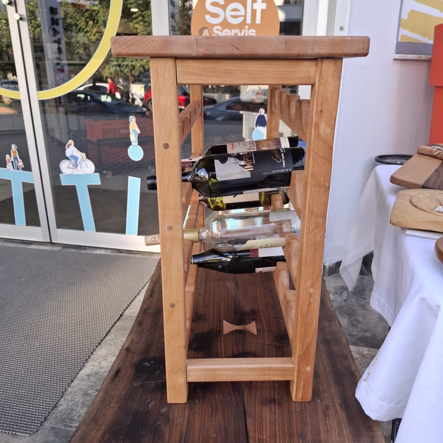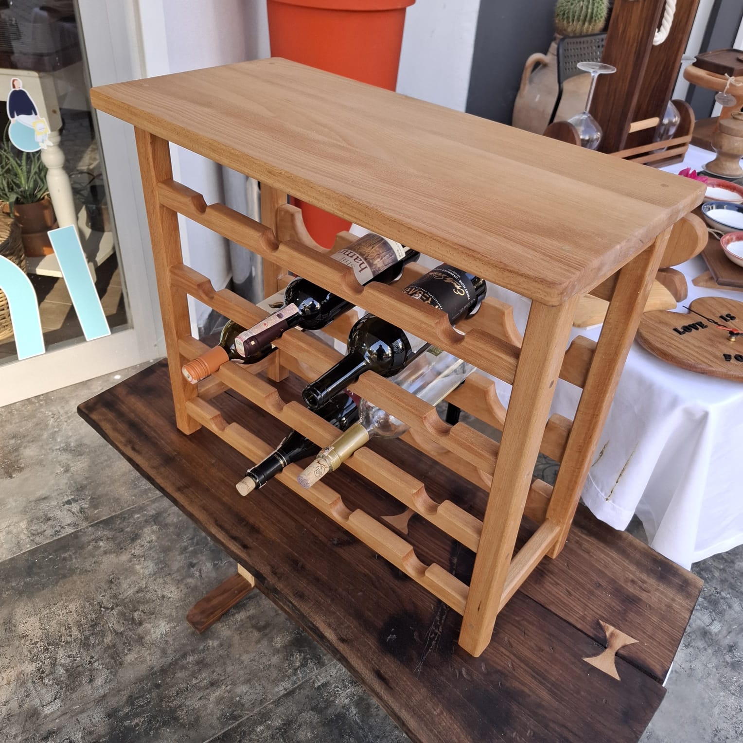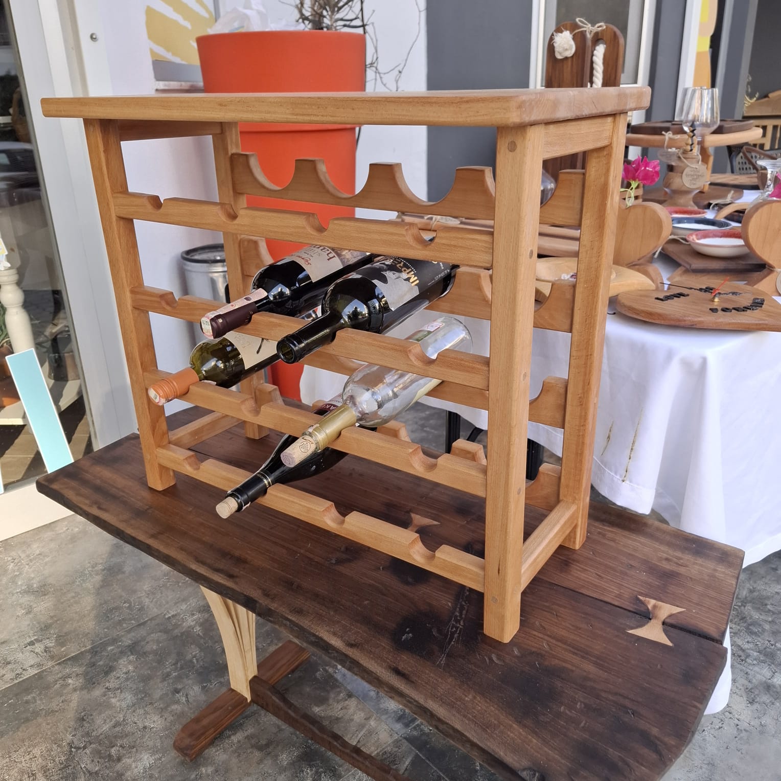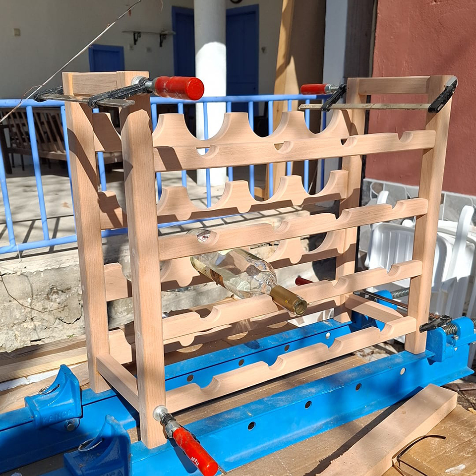 Gürgen ağacından sipariş üzerine yapılmış 16 şişelik bir şarap rafı.